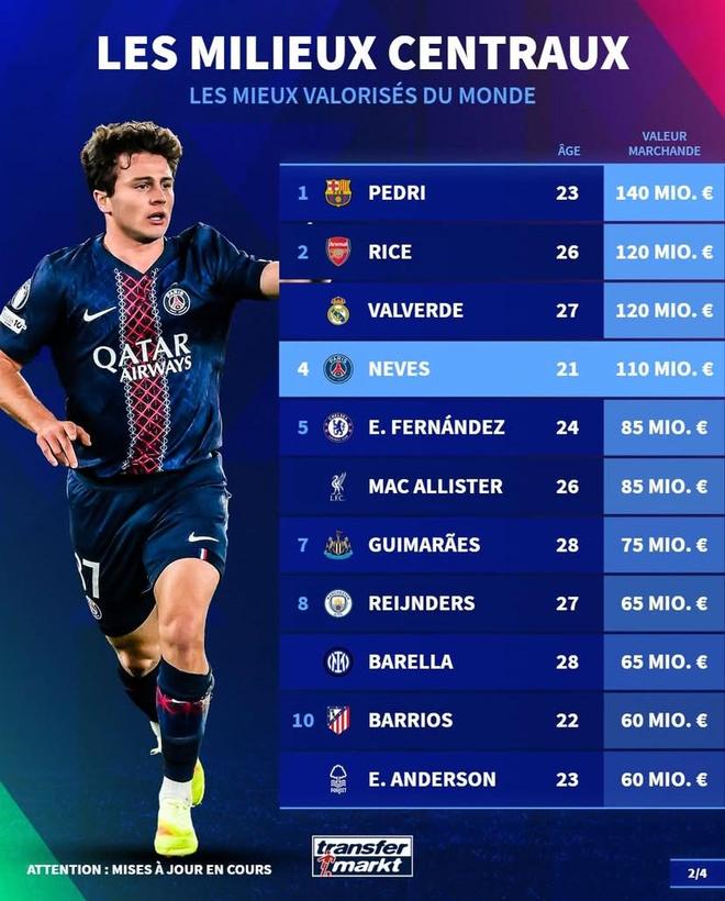 北京时间12月15日,在更新了法甲球员的身价之后,德转列出了目前世界足坛身价排名前10的中前卫,此次更新后身价涨至1.1亿欧元的若昂-内维斯排名第四,仅次于佩德里、赖斯以及巴尔韦德。